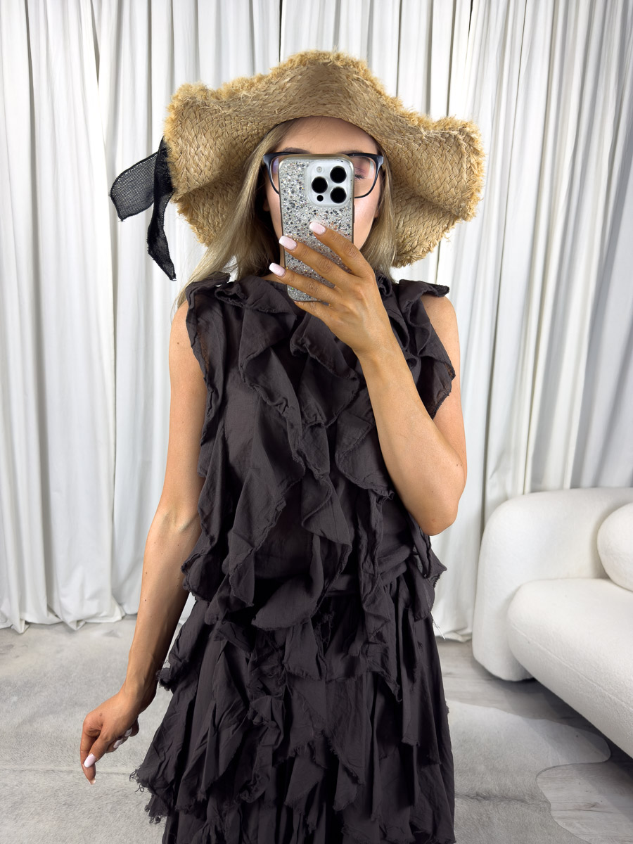 Komplet Milano to kwintesencja nowoczesnego stylu z nutą artystycznej ekstrawagancji. Dwa elementy – top bez rękawów oraz długa spódnica – tworzą spójną, spektakularną całość, której znakiem rozpoznawczym są fantazyjne falbany i efektowna objętość. Ten model przyciąga uwagę swoją formą, wykończeniem i absolutnie wyjątkowym charakterem.