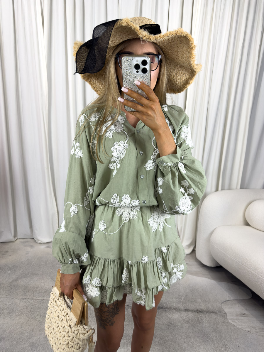 Komplet haftowany Soleil to połączenie nowoczesnej wygody z romantyczną estetyką inspirowaną stylem vintage. Składa się z luźnej, przewiewnej bluzki i krótkiej spódnico-spodenki z elastycznym pasem. Obie części zdobią efektowne, kontrastowe hafty w kształcie kwiatów, które przyciągają wzrok i dodają stylizacji unikalnego charakteru. To propozycja dla kobiet, które lubią łączyć wygodę z modowym akcentem, nie rezygnując przy tym z wyrazistości.
