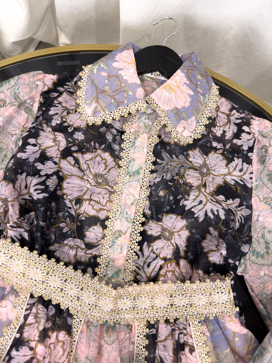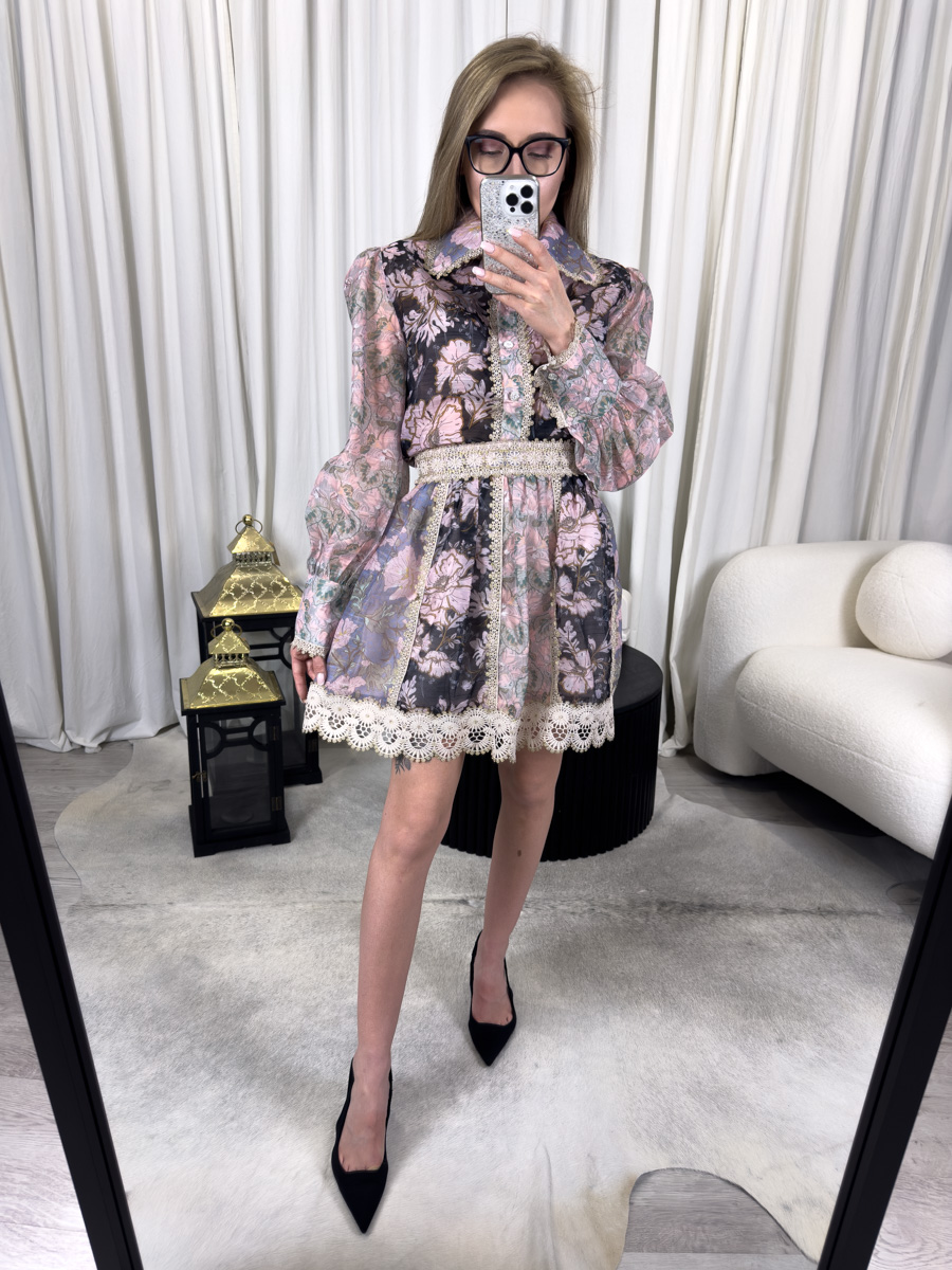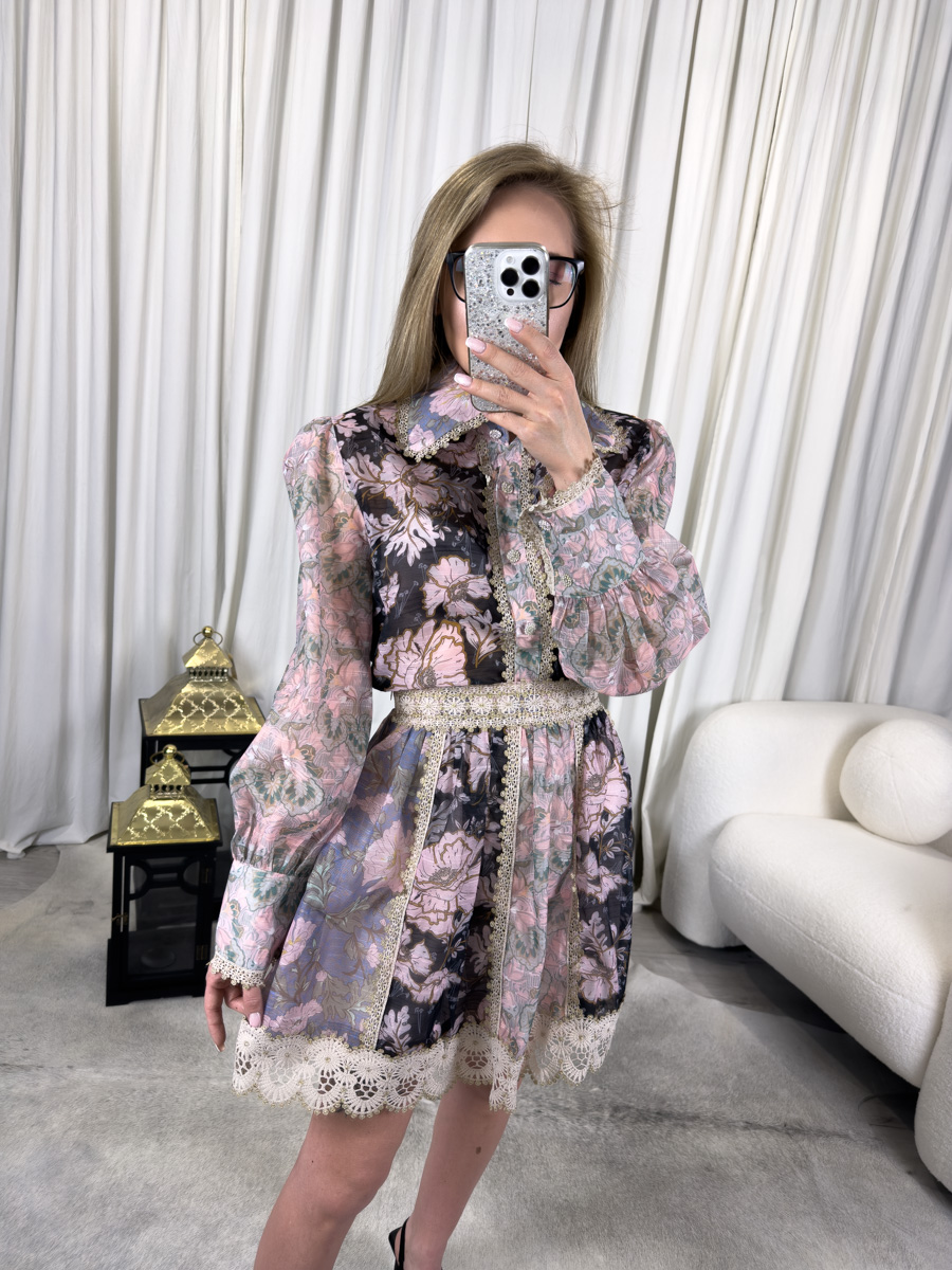 Komplet Laura zachwyca detalami. Koronka zdobi zakończenia rękawów, a także dolną część spódnicy. Dodatkowo ozdobny pas z brokatowym połyskiem pięknie akcentuje talię. Wzór w delikatne, pastelowe kwiaty umieszczony na półprzezroczystym materiale nadaje stylizacji subtelności. Co więcej, połączenie koronki z transparentnością sprawia, że komplet prezentuje się niezwykle kobieco. Dzięki temu świetnie wpisuje się zarówno w nurt glamour, jak i boho chic. Warto podkreślić, że dzięki lekkim i przewiewnym materiałom komplet idealnie sprawdza się w cieplejszych miesiącach.