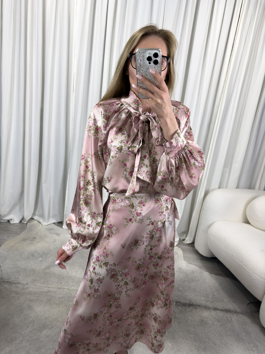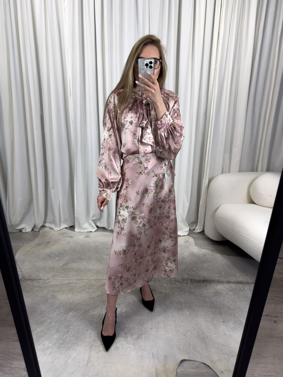 Komplet Vintage to połączenie klasycznej elegancji z romantycznym stylem retro. Subtelny, różowy odcień z kwiatowym nadrukiem przyciąga uwagę i nadaje stylizacji niezwykłej lekkości. Satynowy materiał o delikatnym połysku sprawia, że komplet prezentuje się wyjątkowo szlachetnie, a jednocześnie jest niezwykle przyjemny w dotyku.