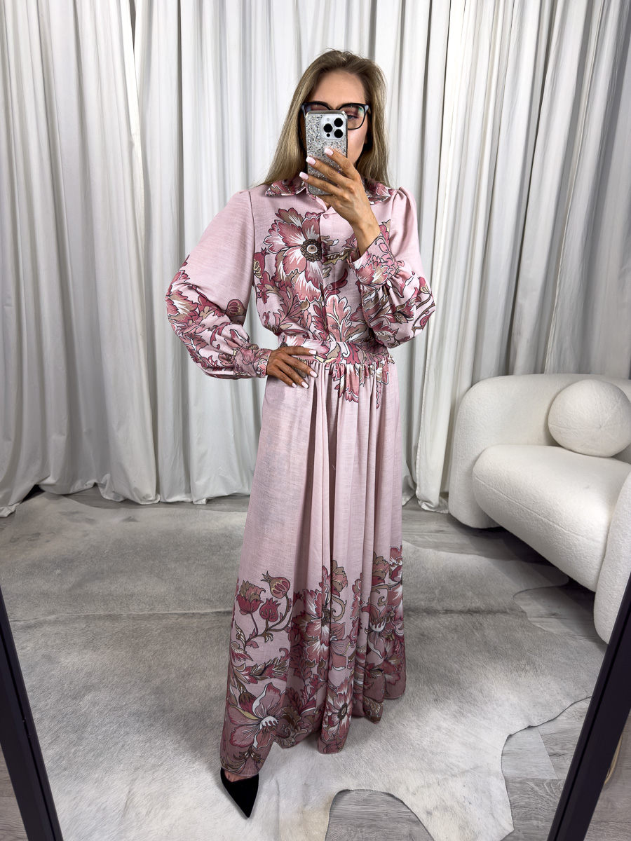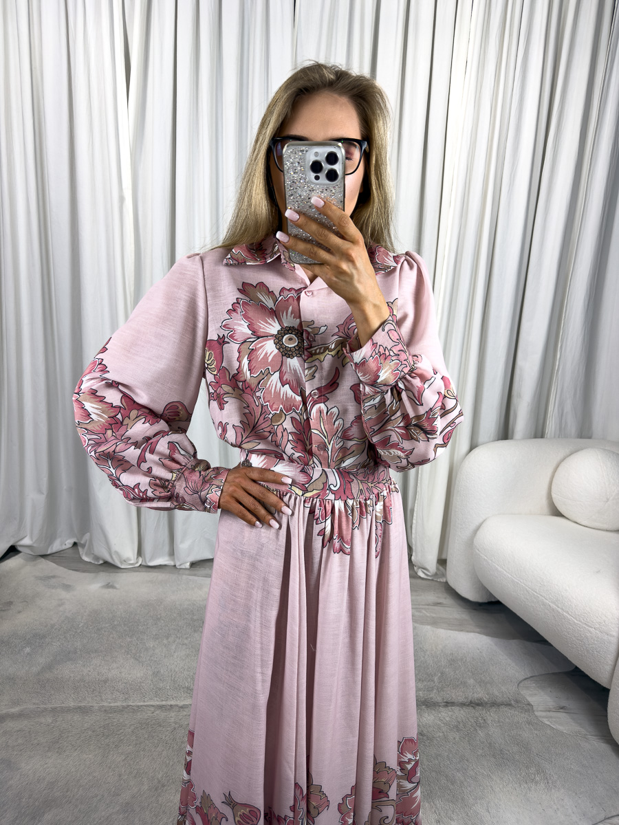 Komplet ze spódnicą Baroque to esencja kobiecego stylu w wydaniu, które przyciąga wzrok i zachwyca detalami. Składający się z długiej spódnicy maxi i koszulowej góry z kołnierzykiem, komplet ten wyróżnia się dopracowanym krojem, szlachetnym nadrukiem w stylu barokowym oraz elegancką kolorystyką w odcieniach pudrowego różu i bordo. To stylizacja, która świetnie sprawdzi się zarówno na specjalne okazje, jak i w codziennym, wyrafinowanym wydaniu.