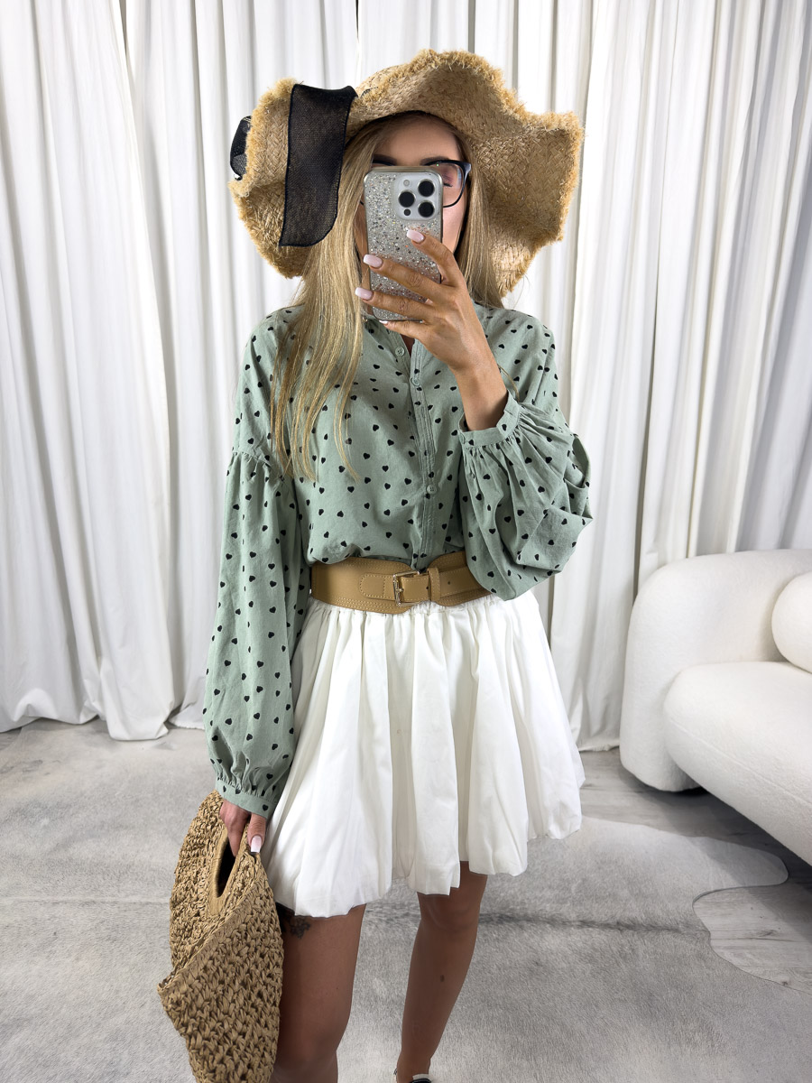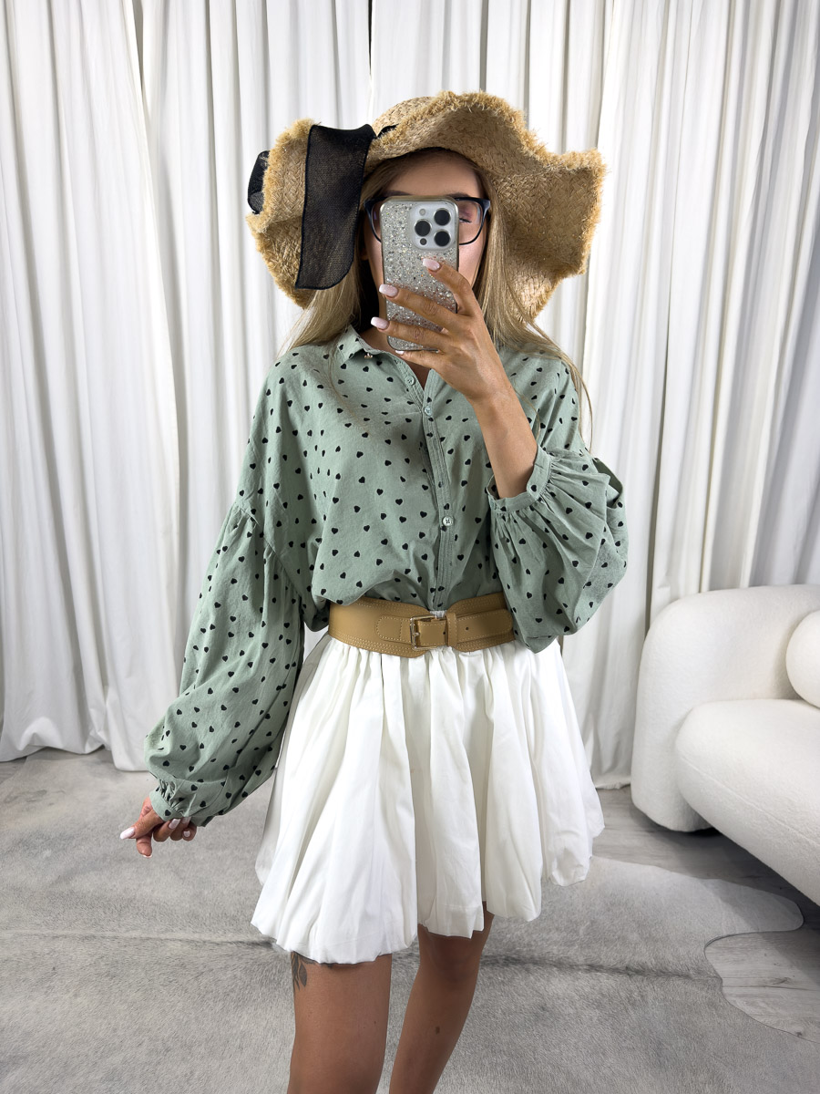 Włoska koszula Nina w kolorze pistacjowym to kwintesencja stylu casual romantic. Jej pastelowy odcień zieleni w połączeniu z uroczym nadrukiem w czarne serduszka tworzy nietuzinkową kompozycję, która przyciąga wzrok i zachwyca lekkością. Ten model łączy w sobie nowoczesny oversize z wyrafinowaną kobiecością, dzięki czemu sprawdzi się zarówno w codziennym looku, jak i bardziej stylizowanych zestawieniach.