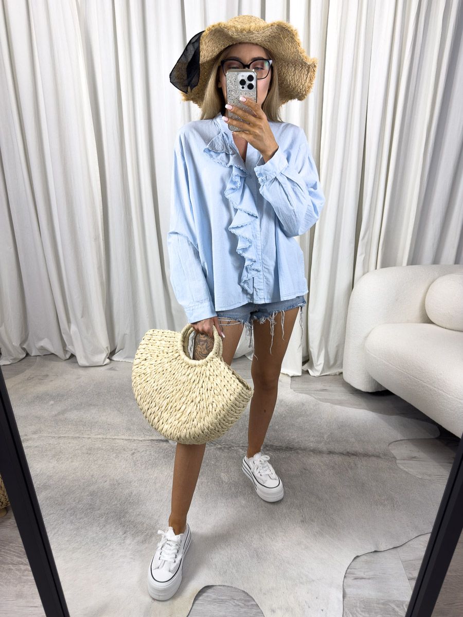 Charakterystycznym elementem koszuli Vita jest romantyczna falbana biegnąca asymetrycznie przez przód i zakończona przy mankiecie. To właśnie ona nadaje koszuli lekkości i niebanalnego wyglądu. Luźny krój i miękki materiał zapewniają wygodę nawet w cieplejsze dni. Długi rękaw zakończony klasycznym mankietem wprowadza do całości nutę elegancji.
