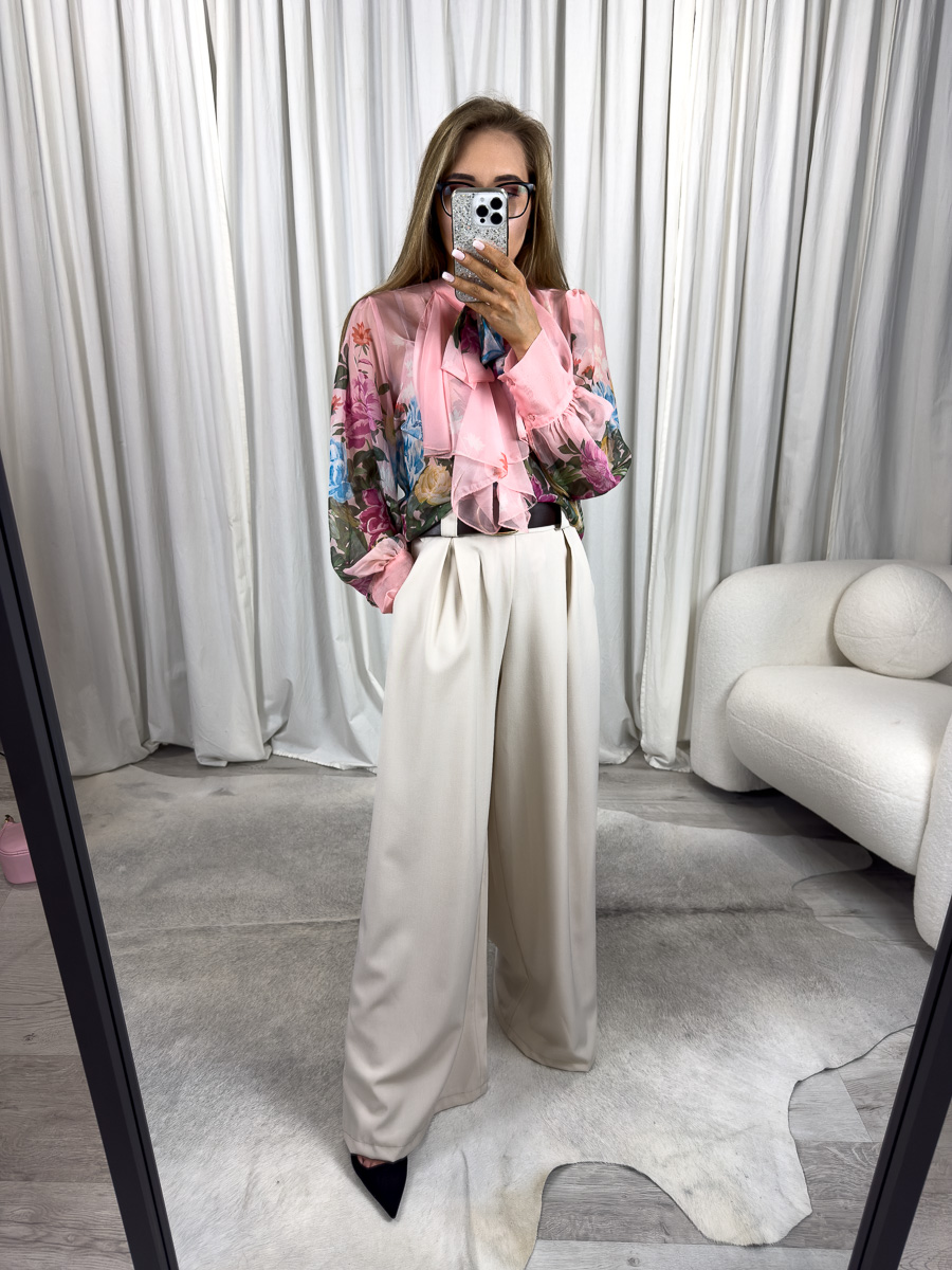 Koszula została zaprojektowana z dbałością o detale – efektowny żabot dodaje charakteru, a ozdobna kokarda przy dekolcie wprowadza subtelny, retro akcent. Rękawy wykończone mankietem podkreślają nadgarstki i dodają całości wyrafinowania. Wzór w kwiaty zachowany jest w spójnej, pastelowo-kontrastowej palecie, co umożliwia tworzenie zarówno romantycznych, jak i bardziej formalnych stylizacji.