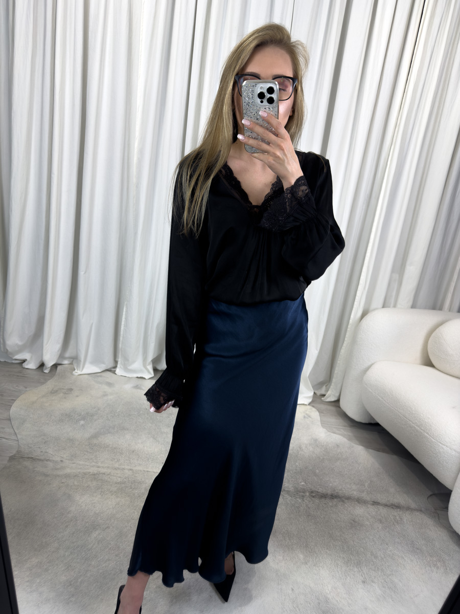 Spódnica Satine Navy świetnie prezentuje się z czarną bluzką satynową z koronkowymi wykończeniami – to połączenie idealne na wieczór lub formalne spotkania. Możesz także zestawić ją z białą koszulą oversize, dzianinowym topem lub swetrem w neutralnych tonacjach, takich jak beż, szarość czy écru.