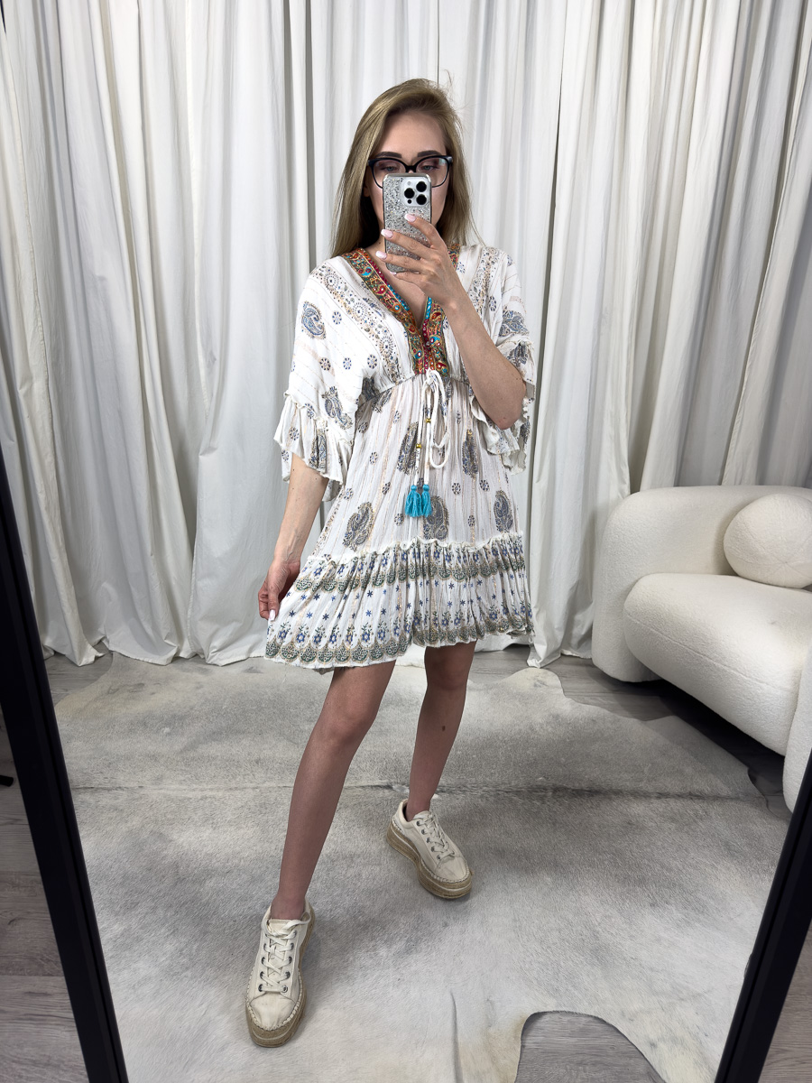 Fason sukienki jest luźny i przewiewny, z elastycznym wiązaniem w talii, co pozwala idealnie dopasować ją do sylwetki. Rękawy typu kimono nadają całości lekkości, a krótka długość pięknie eksponuje nogi. Dekolt w literę V przyciąga wzrok dzięki ozdobnemu haftowi i kolorowym akcentom w stylu boho. Plisowany dół porusza się z gracją i tworzy subtelny, dynamiczny efekt podczas chodzenia.