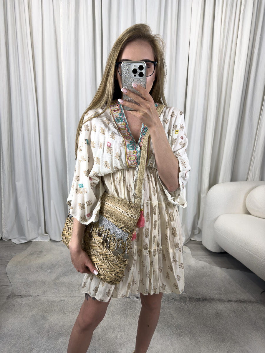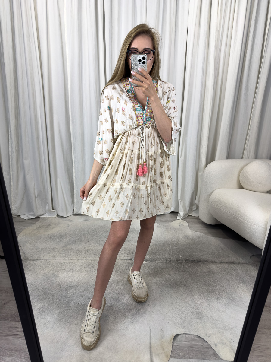 Boho sukienka w odcieniach kremu ze złotym nadrukiem i kolorowym haftem.
