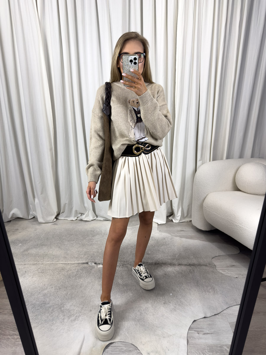 Ten model to wyjątkowa propozycja dla kobiet, które cenią sobie wygodę, ciepło i oryginalny styl. Miękki w dotyku materiał otula ciało niczym ulubiony koc, a jednocześnie prezentuje się modnie i kobieco. Uroku dodaje haftowana aplikacja przedstawiająca eleganckiego misia w niebieskiej marynarce, która przyciąga wzrok i nadaje całości nietuzinkowego charakteru. Dzięki uniwersalnemu odcieniowi śmietankowej bieli ten ciepły sweter wpasuje się zarówno w codzienne stylizacje, jak i w te bardziej wysmakowane.
