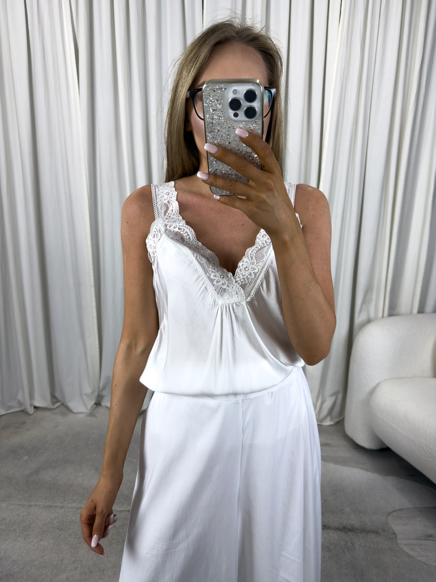 Top satynowy Sia to wyjątkowa propozycja dla kobiet, które cenią połączenie subtelnej elegancji z wygodą noszenia. Wykonany z miękkiej, połyskującej tkaniny satynowej, delikatnie otula ciało i pięknie odbija światło, tworząc efekt luksusowej lekkości. Dekolt ozdobiony został finezyjną koronką, która dodaje romantycznego charakteru i kobiecego wdzięku. To doskonała baza do wielu stylizacji – zarówno codziennych, jak i bardziej wieczorowych.