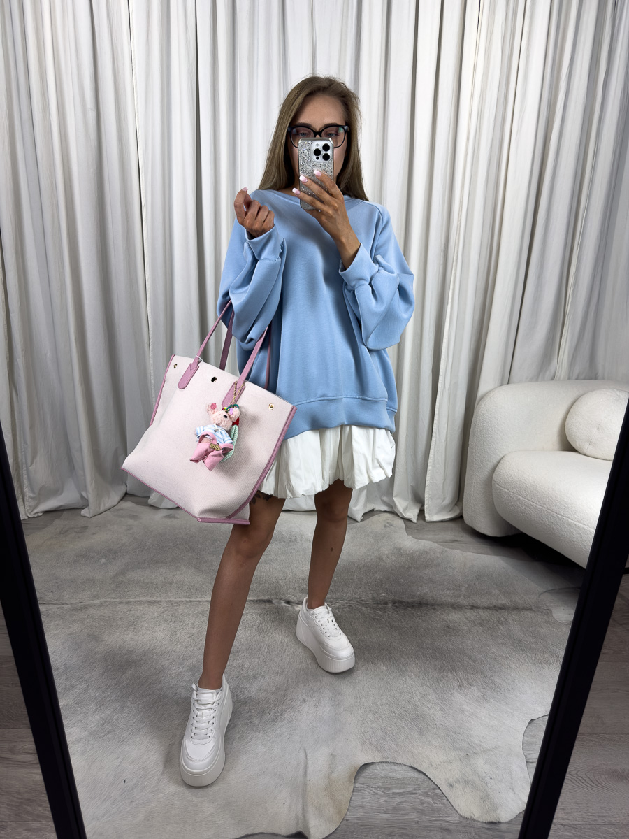 Bluza oversize Casual niebieska sprawdzi się zarówno w stylizacjach sportowych, jak i miejskich. Możesz zestawić ją z plisowaną spódnicą, legginsami lub ulubionymi jeansami. Z powodzeniem stworzy także modny look z oversize torbą i sneakersami, jak na załączonym zdjęciu. Jej prostota sprawia, że będzie pasowała do wielu elementów Twojej garderoby, stanowiąc jej modową bazę.