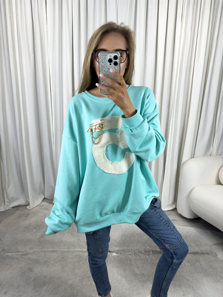 Bluza oversize Five turkusowa to połączenie miejskiego stylu z komfortem i wyrazistym akcentem. Wyróżnia ją modny, pastelowy odcień turkusu, który doskonale komponuje się zarówno z jasnymi, jak i ciemnymi elementami garderoby. Charakterystyczny nadruk z dużą cyfrą 5 z przodu bluzy nadaje jej sportowy, nowoczesny charakter, a ozdobna przypinka z łańcuszkiem w kolorze złota dodaje modowego sznytu i oryginalności.