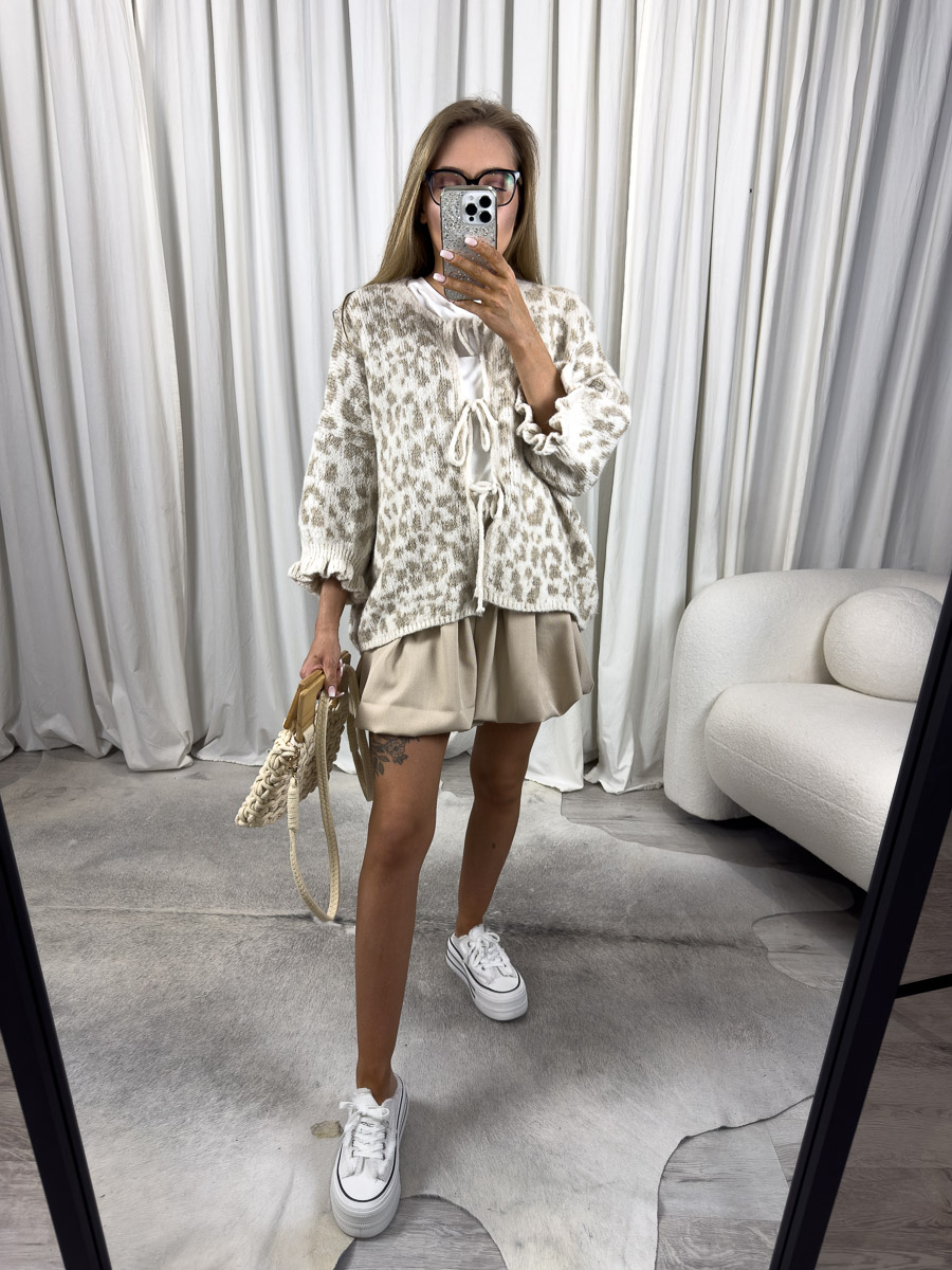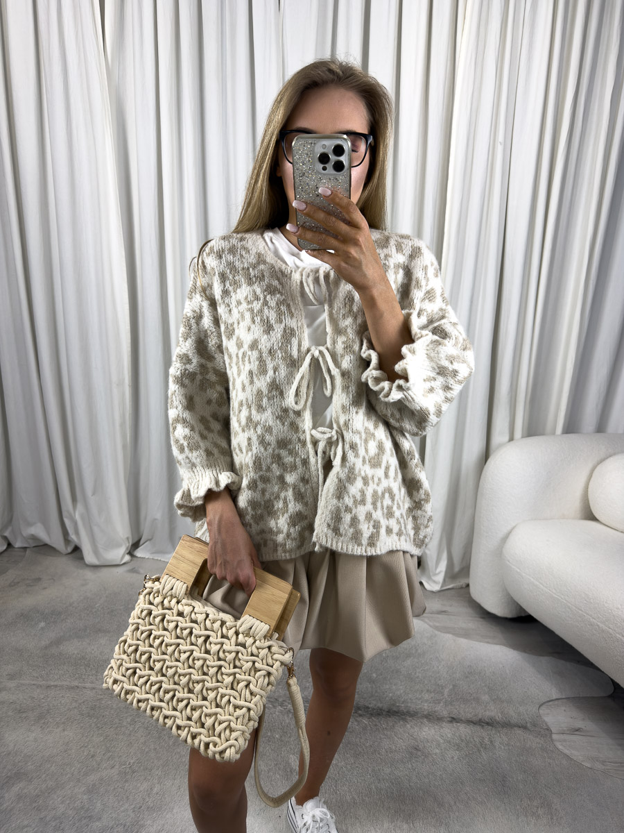 Kardigan Tessa to model, który łączy nowoczesny wzór z funkcjonalnym fasonem oversize, co zapewnia modny, a zarazem wygodny efekt. Połączenie beżu z kremowym tłem tworzy ponadczasowy delikatny wzór inspirowany animal printem, który przyciąga uwagę. Co więcej, miękka i gruba dzianina gwarantuje komfort termiczny oraz przyjemne odczucia w trakcie noszenia. Dzięki temu kardigan doskonale sprawdzi się zarówno w chłodne dni, jak i podczas sezonu przejściowego.