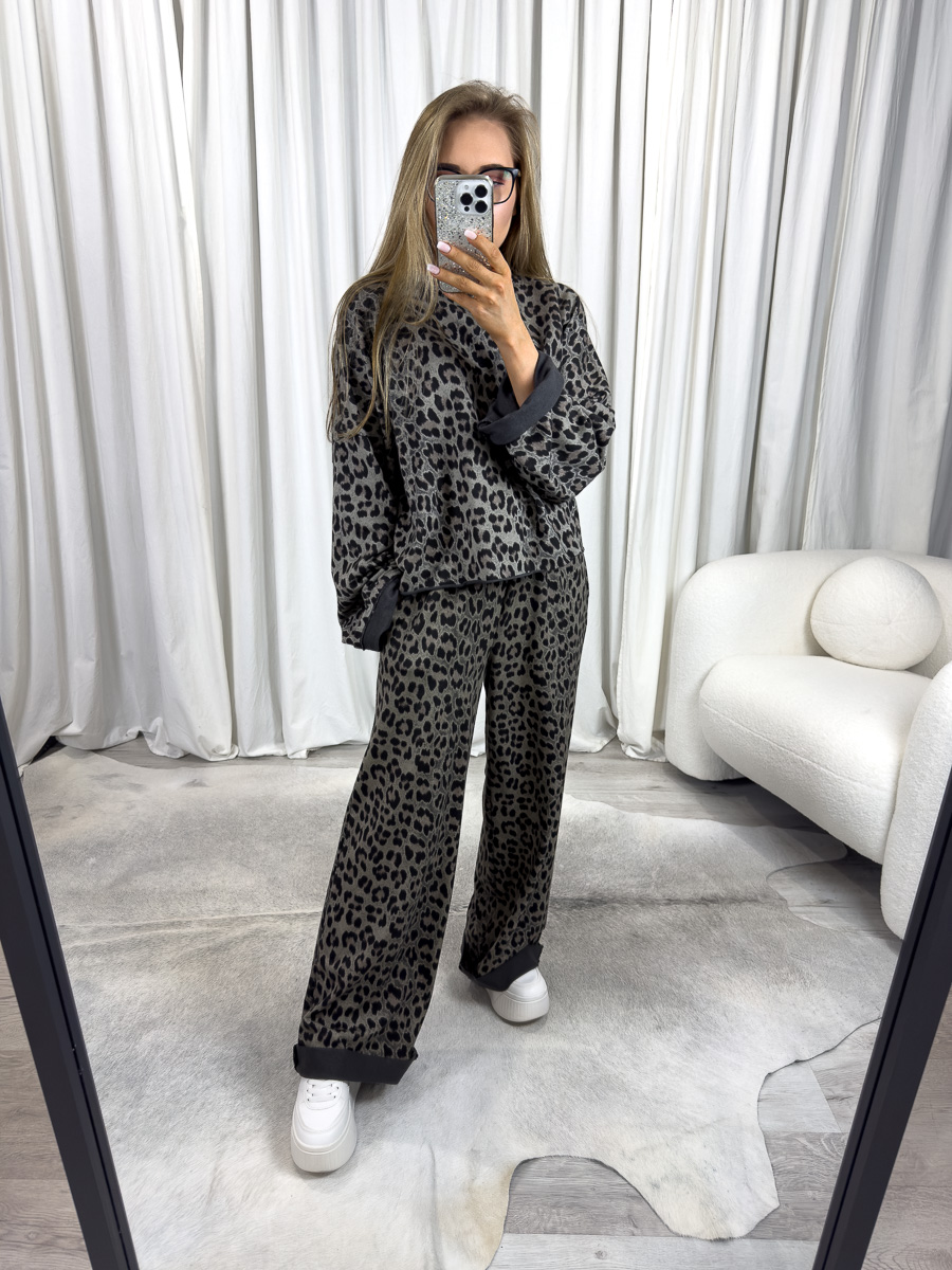 Zarówno bluza, jak i spodnie posiadają wykończenia w jednolitym, ciemnozielonym kolorze – mankiety i dół nogawek są wywinięte, co dodaje całości charakterystycznego luzu i nonszalancji. Bluza ma luźny, pudełkowy fason z lekko opadającą linią ramion, a spodnie – proste, szerokie nogawki, które pięknie układają się w ruchu. Dzięki przemyślanej konstrukcji komplet nie tylko świetnie wygląda, ale też modeluje sylwetkę i sprawia, że całość prezentuje się stylowo i kobieco.