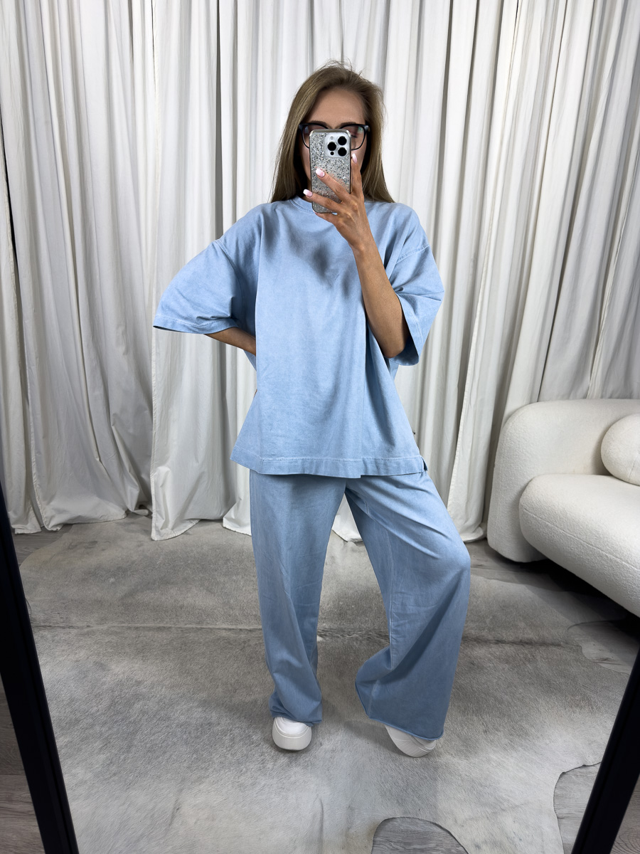 Komplet został wykonany z miękkiej, wysokogatunkowej dzianiny bawełnianej z dodatkiem elastanu, która nie tylko pięknie układa się na sylwetce, ale zapewnia przyjemność noszenia przez cały dzień. Oversizowy, luźny T-shirt z obniżoną linią ramion oraz szerokie spodnie z wysokim stanem to klasyka stylu Wiya – minimalistyczna forma z nutą nowoczesności, wpisująca się w aktualne trendy wygodnego, miejskiego looku. Pastelowy błękit, będący jednym z najbardziej pożądanych kolorów sezonu, dodaje całości świeżości i sprawia, że komplet prezentuje się wyjątkowo stylowo niezależnie od sytuacji.