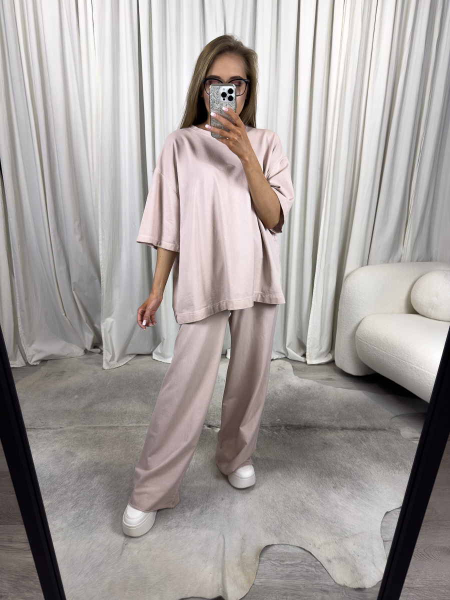 Pastelowy kolor w połączeniu z prostą formą sprawia, że komplet świetnie odnajdzie się w garderobie każdej kobiety ceniącej komfort, ale nie rezygnującej z modowego sznytu. To ubranie, które idealnie wpisuje się w trend casual chic, oferując nie tylko wygodę, ale także subtelną elegancję.