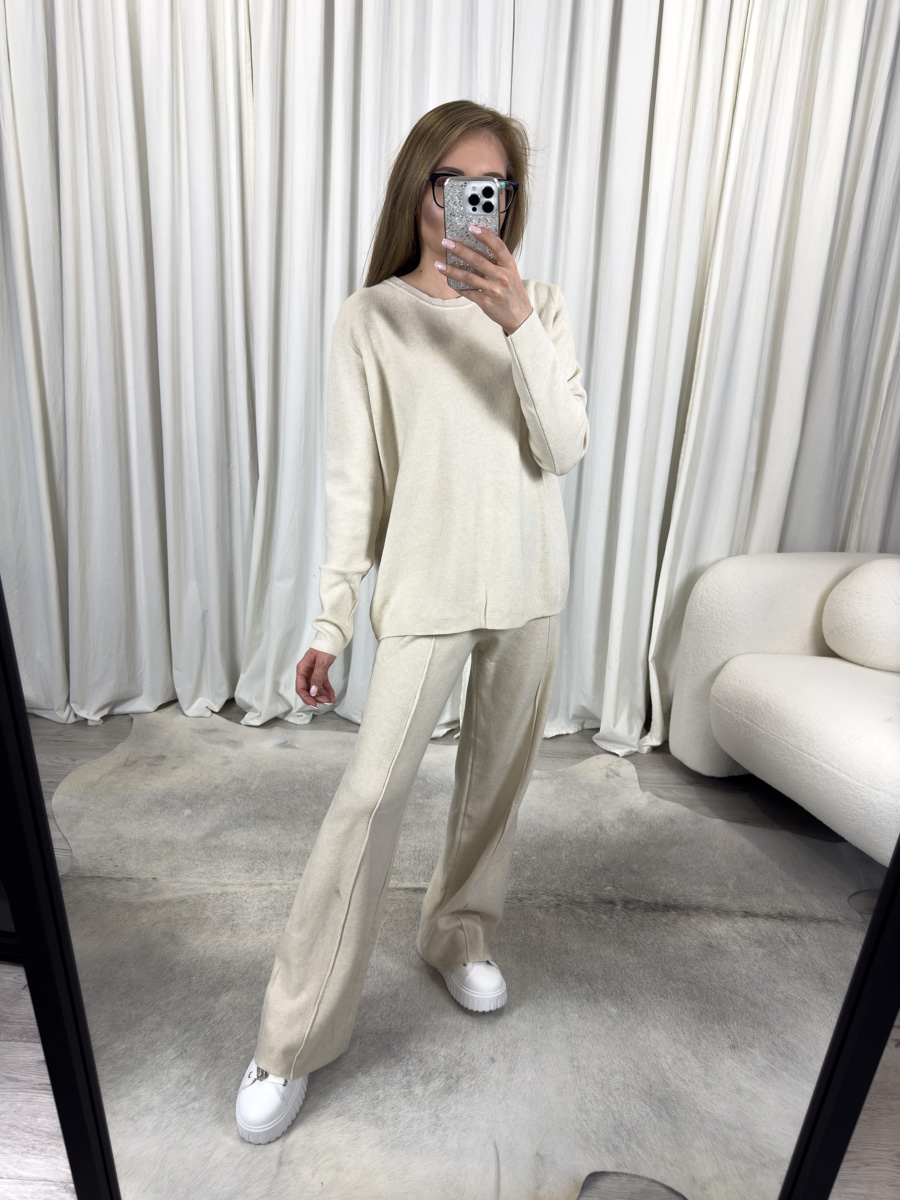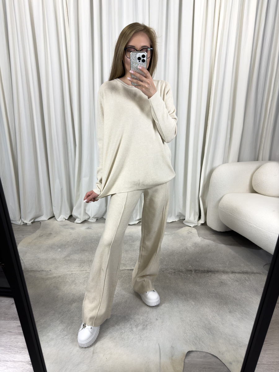 Ciepły odcień kremowy wpisuje się w najnowsze trendy i pasuje do niemal każdej karnacji. Dzięki minimalistycznej formie i neutralnej kolorystyce komplet możesz zestawiać z różnorodnymi dodatkami – od sneakersów i plecaka, po biżuterię i eleganckie torebki. Całość wygląda nonszalancko, ale bardzo estetycznie.