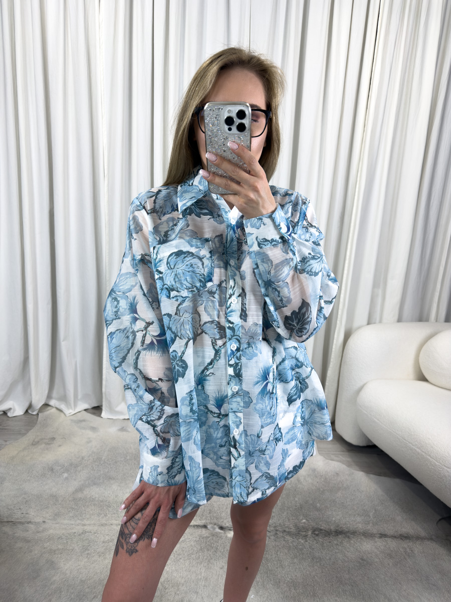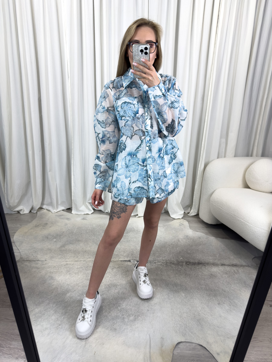 Komplet Tropical to niezwykle kobiecy i lekki zestaw, który doskonale wpisuje się w klimat lata, wakacyjnego luzu i miejskiego stylu. Składający się z luźnej koszuli z długim rękawem oraz krótkich spodenek, komplet przyciąga wzrok oryginalnym wzorem i subtelnym wykończeniem. Całość nawiązuje do boho estetyki i śródziemnomorskiej nonszalancji – z delikatnymi zdobieniami, fałdami i wykończeniami przy dekolcie oraz mankietach.