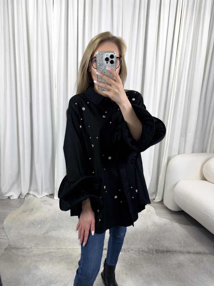 Koszula przyciąga uwagę dzięki błyszczącym aplikacjom rozmieszczonym na całej powierzchni. To one dodają jej szyku i sprawiają, że model zyskuje unikalny charakter. Bufiaste rękawy wykończone dekoracyjną falbaną podkreślają lekkość całej stylizacji, a jednocześnie wprowadzają oryginalny, modowy akcent. Dlatego ten model doskonale nadaje się zarówno na spotkania biznesowe, jak i eleganckie kolacje czy wieczorne wyjścia.