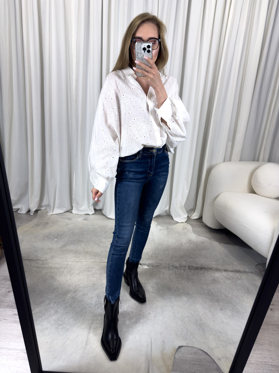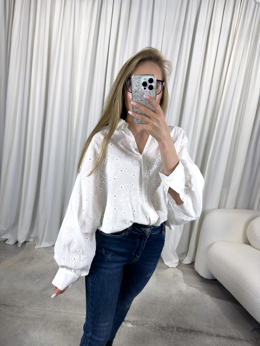 Koszula haftowana Flowers Wiya to kwintesencja kobiecego stylu z włoskim akcentem. Model zachwyca lekkością oraz romantycznymi detalami, które idealnie wpisują się w aktualne trendy modowe. Biała koszula wykonana została z przewiewnej tkaniny ozdobionej subtelnym haftem w kwiatowe wzory. Dzięki temu koszula prezentuje się elegancko, a jednocześnie bardzo świeżo.