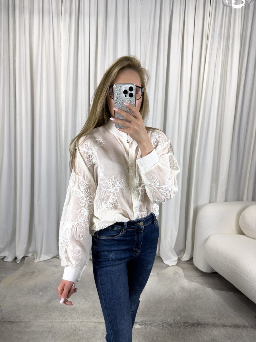 Koszula haftowana Roses to klasyczna koszula damska z haftem róż. Dzięki lekkiej tkaninie i bufiastym rękawom sprawdzi się w codziennych i eleganckich stylizacjach.