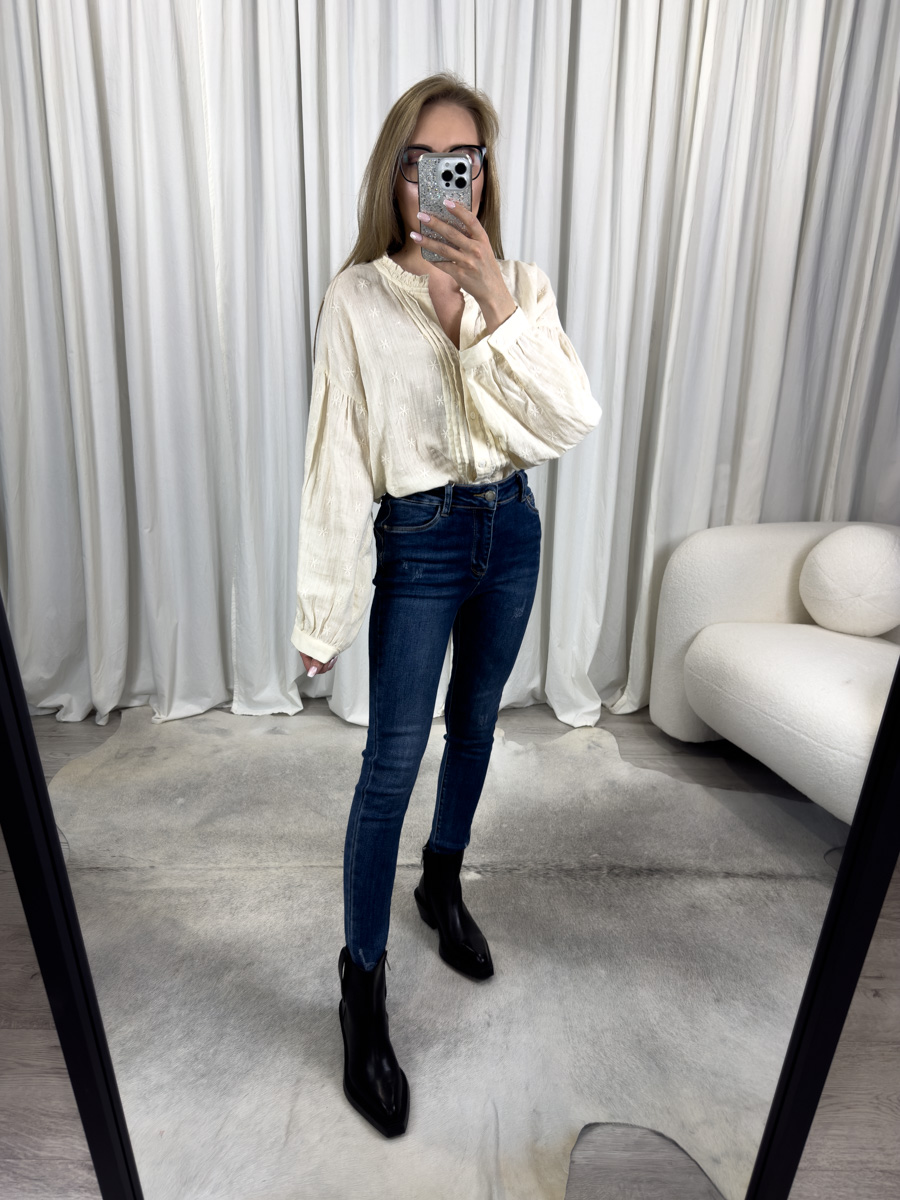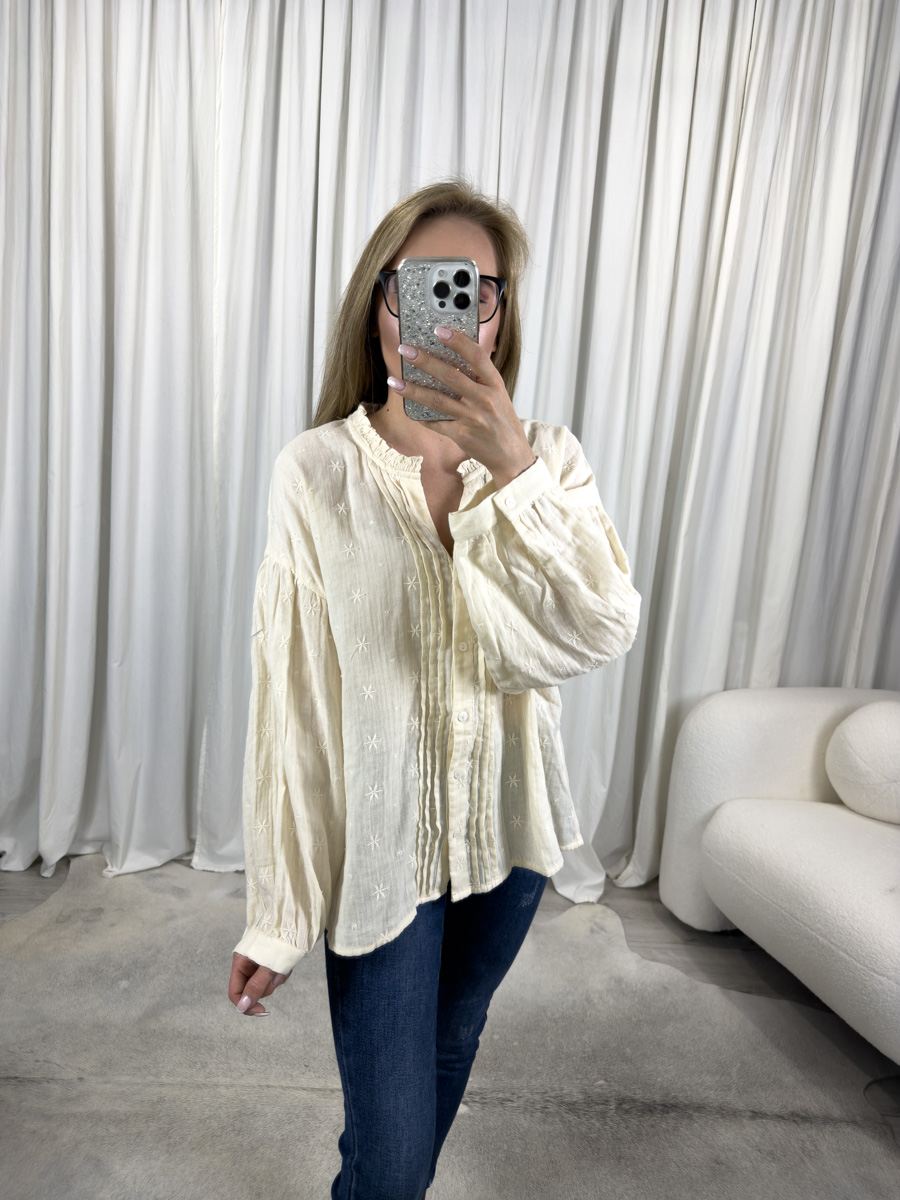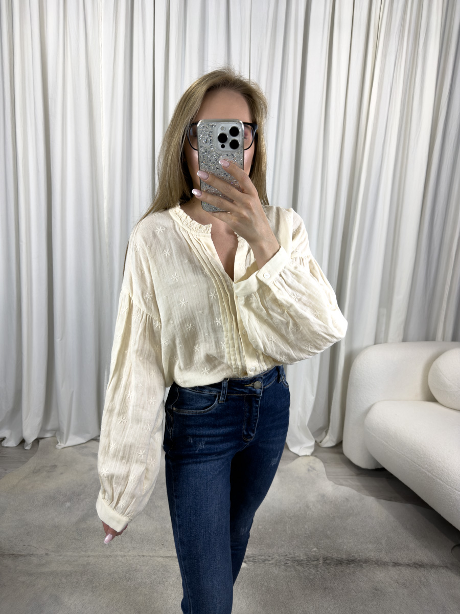 Koszula haftowana Stars w kremowym odcieniu to połączenie swobody i subtelnej elegancji. Luźny fason, dekoracyjny haft i romantyczne detale sprawiają, że będzie Twoją ulubioną bazą do wielu stylizacji.
