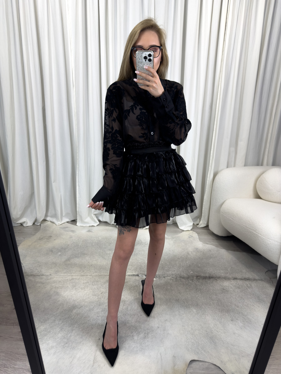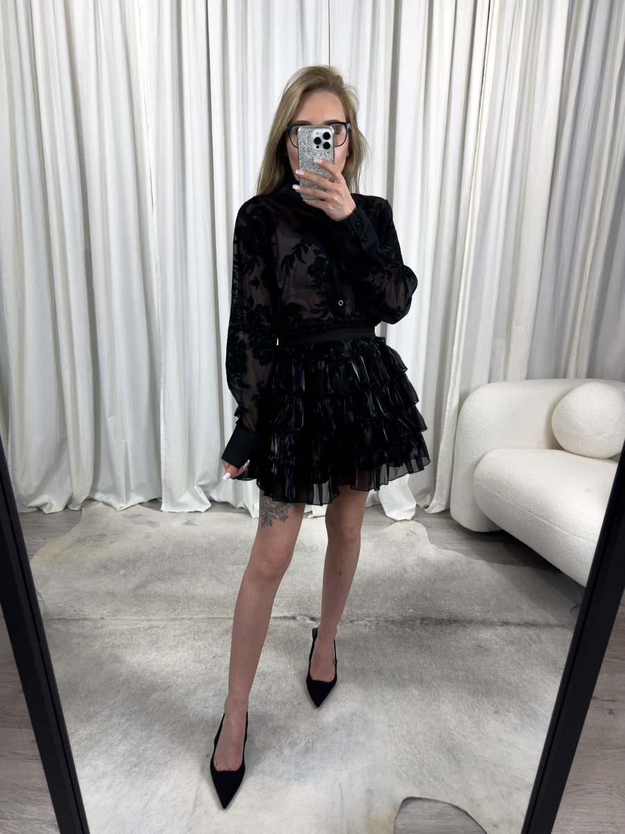Koszula mgiełka Rose w kolorze czarnym zachwyca nie tylko tkaniną, ale także bogato zdobionym, aksamitnym wzorem o kwiatowym motywie. To właśnie on sprawia, że model prezentuje się niezwykle luksusowo i wyróżnia się na tle klasycznych koszul. Długie, bufiaste rękawy z mankietem na guziki dodają jej lekkości i nowoczesnej formy, dzięki czemu koszula nie tylko podkreśla kobiecość, lecz także zapewnia wygodę noszenia.