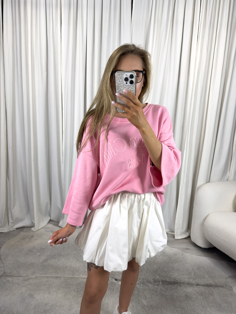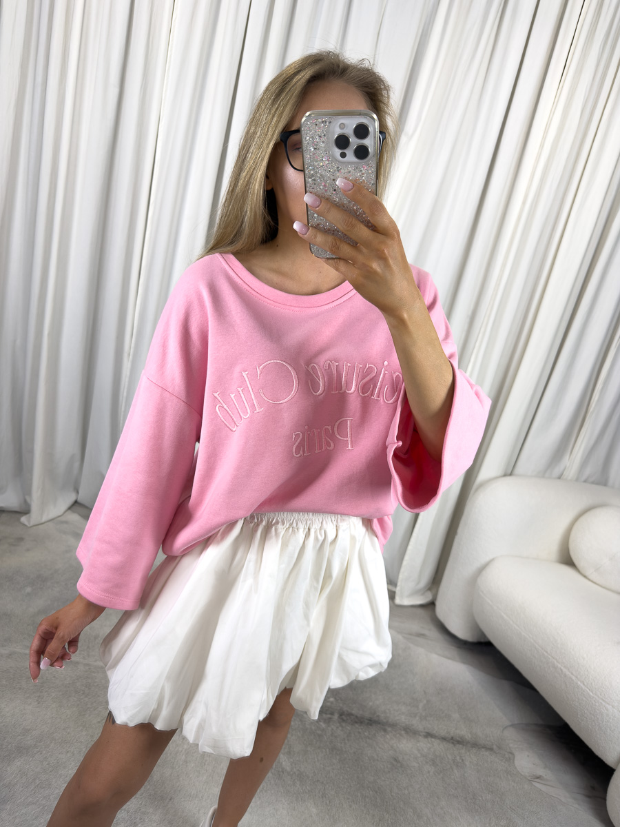 Model wyróżnia się luźnym, oversize’owym krojem z szerokimi rękawami 3/4 oraz subtelnym dekoltem łódkowym, który pięknie eksponuje linię ramion, nadając sylwetce lekkości i kobiecego charakteru. Delikatny haft z napisem „Leisure Club Paris” na przodzie bluzy dodaje jej stylowego, miejskiego sznytu, nawiązując do francuskiego luzu i swobody.