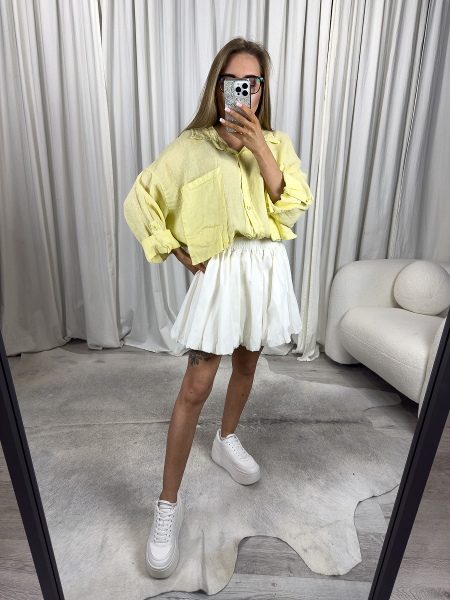 Koszula Amber w odcieniu żółtym pasuje do stylizacji zarówno codziennych, jak i bardziej efektownych. Możesz nosić ją z przewiewnymi spodniami z lnu, dopasowanymi jeansami albo białą spódnicą o bufiaszowym kroju – jak na prezentowanym zdjęciu. Świetnie współgra z dodatkami w stylu boho, sandałami na platformie czy espadrylami. Latem noś ją rozpiętą na top, a wiosną w duecie z dżinsową kurtką.