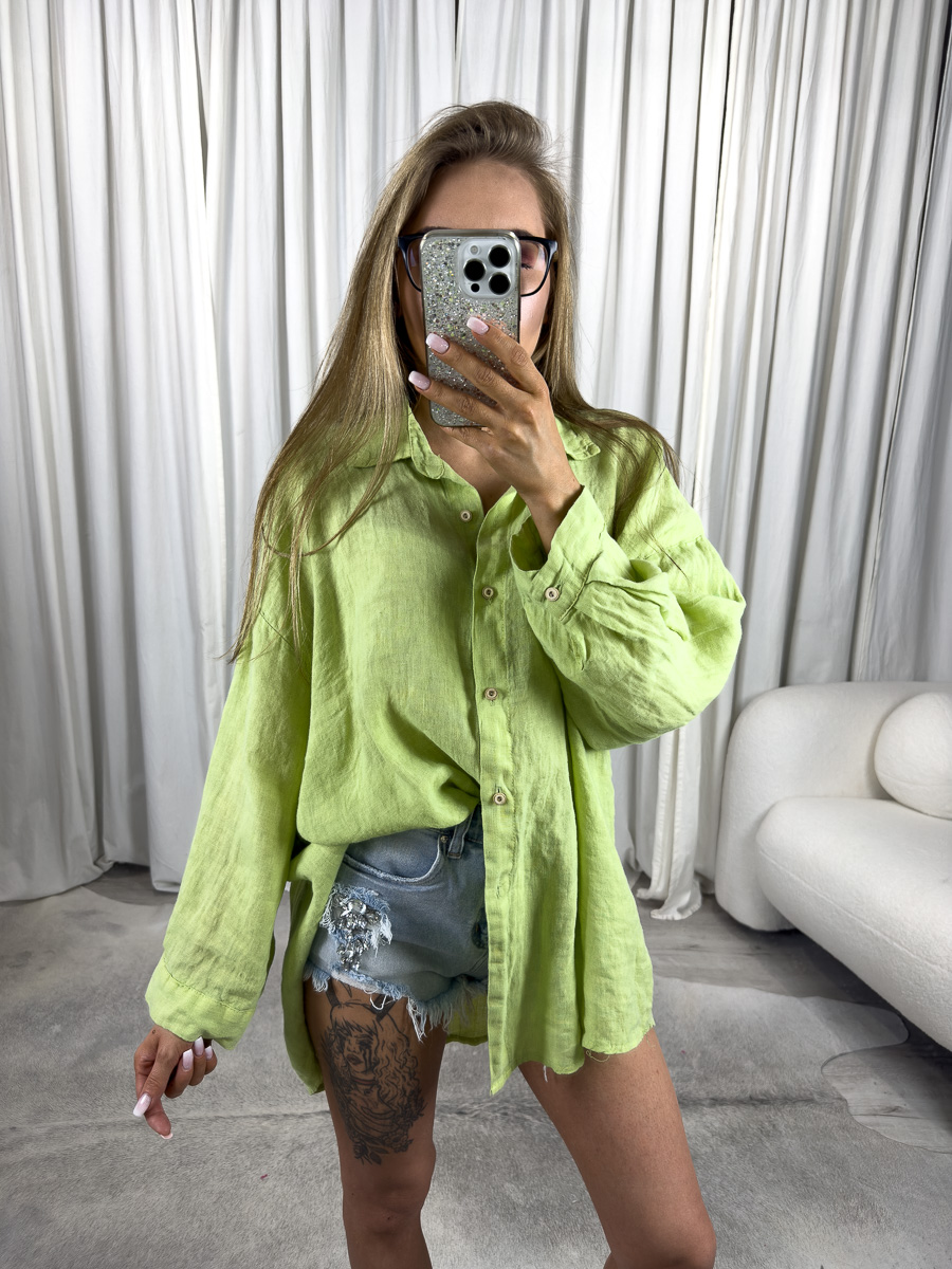 Lniana koszula oversize Elize od Wiya w odcieniu intensywnej zieleni to propozycja dla kobiet, które lubią łączyć wygodę z wyrazistym stylem. Jej kolor przyciąga wzrok i świetnie współgra z opalenizną. Jednocześnie nie dominuje stylizacji – z łatwością zestawisz ją z bielą, denimem czy beżami.