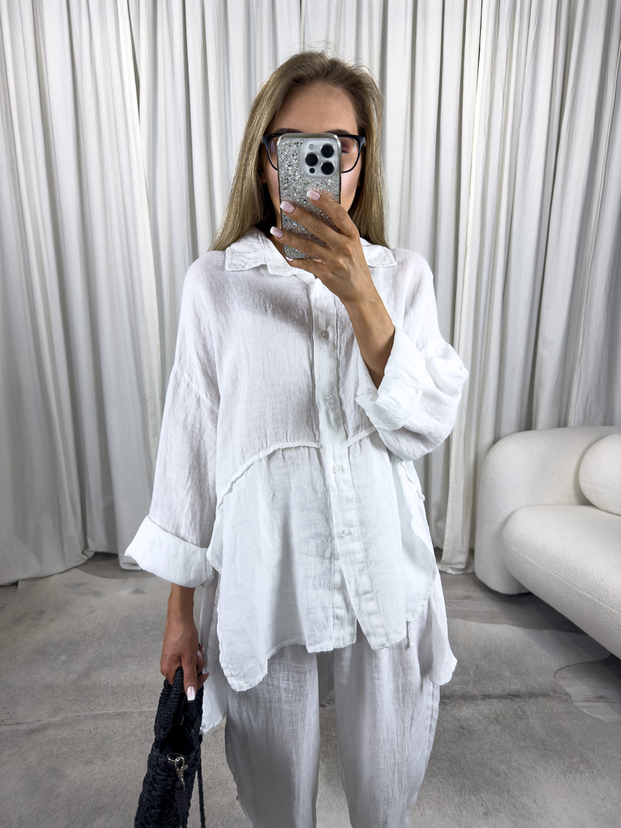 Biała lniana koszula Lori od Wiya to ponadczasowy element garderoby, który zachwyca nie tylko elegancją, lecz także wygodą noszenia. Została uszyta z naturalnego, przewiewnego lnu, co sprawia, że świetnie sprawdza się w cieplejsze dni – zarówno na co dzień, jak i w bardziej eleganckim wydaniu. Luźniejszy, lekko oversize’owy krój dodaje lekkości i swobody ruchów, nie tracąc przy tym na kobiecości.
