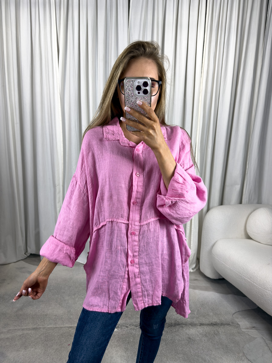 Lniana koszula Lori Wiya różowa to kobieca, lekka propozycja z naturalnego lnu. Oversize’owy fason i pastelowy odcień tworzą idealny duet na lato.