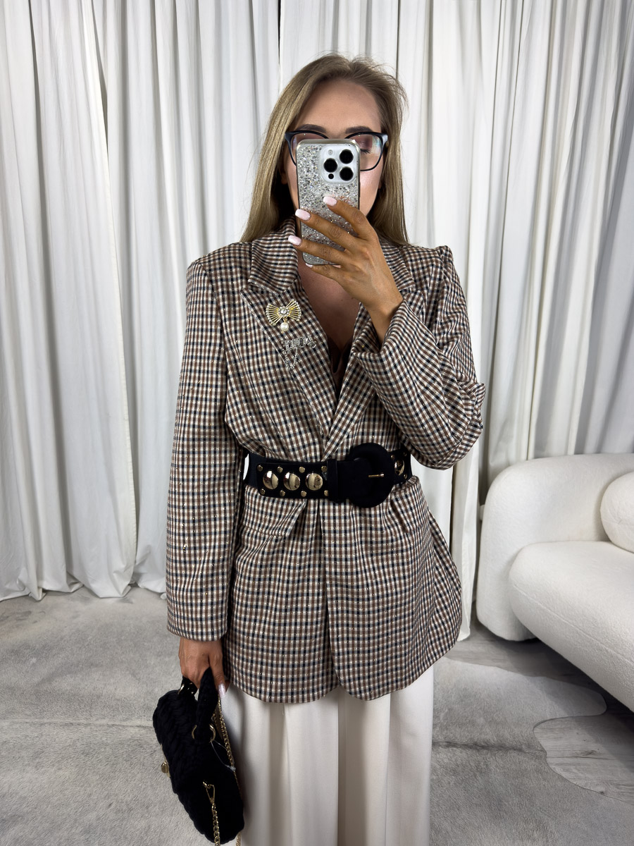 Na uwagę zasługują także detale, takie jak ozdobna broszka, która nadaje całości niepowtarzalnego charakteru. Można ją również dowolnie wymieniać lub zdejmować, dostosowując wygląd marynarki do konkretnej okazji. Dwie praktyczne kieszenie z przodu podkreślają jej funkcjonalność i użytkowy charakter.