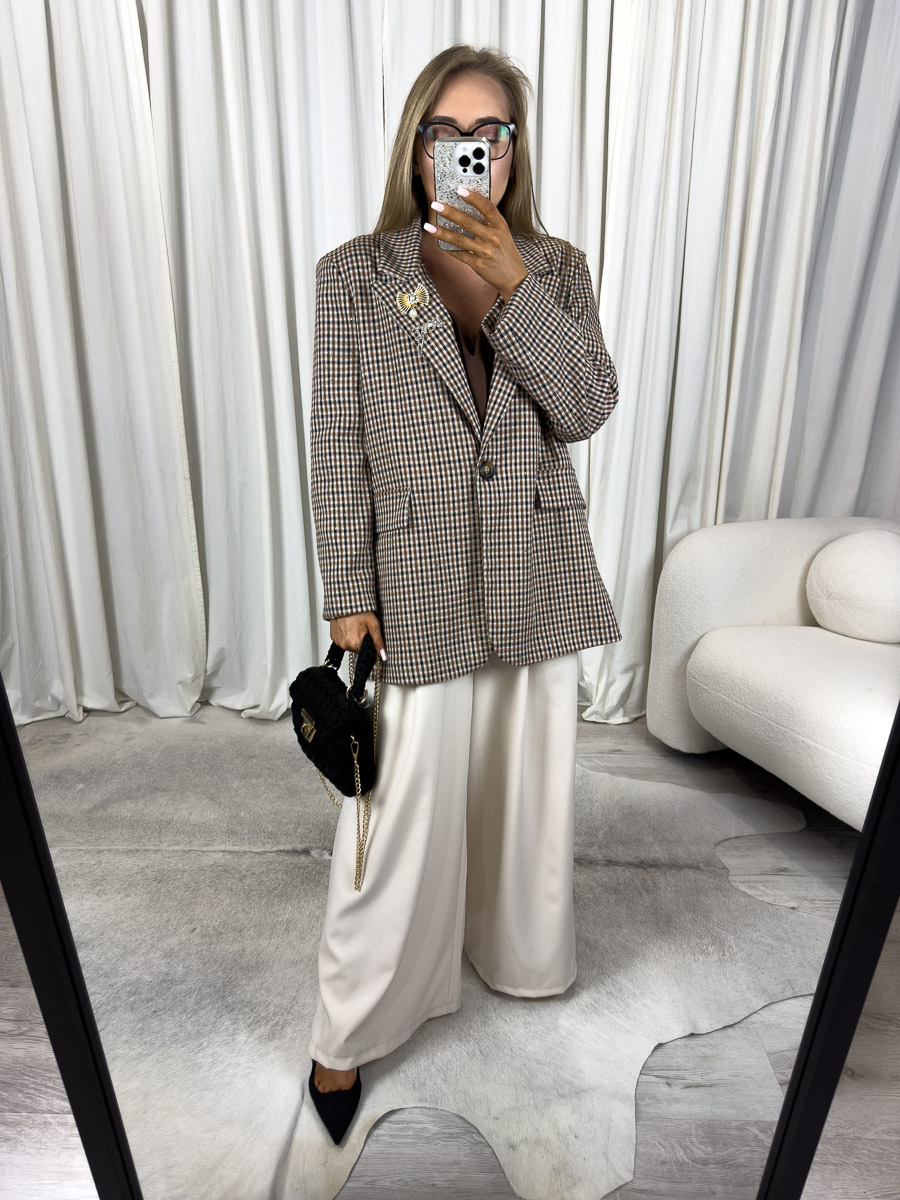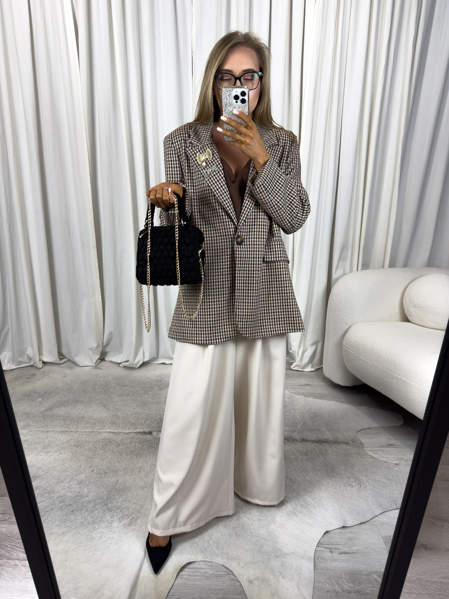 Tkanina, z której wykonano marynarkę Glam, zachwyca swoją strukturą – delikatnie teksturowany materiał sprawia, że całość prezentuje się wyjątkowo stylowo. Jednorzędowe zapięcie, klasyczny kołnierz oraz lekko wydłużony fason dodają jej lekkości i eleganckiej geometrii. Marynarka nie jest dopasowana, co sprawia, że świetnie wygląda noszona zarówno samodzielnie, jak i narzucona na bluzkę, cienki golf czy jedwabną sukienkę.
