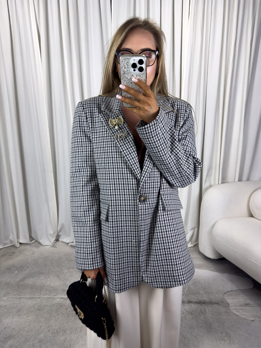 Tkanina, z której wykonano marynarkę Glam, zachwyca swoją strukturą – delikatnie teksturowany materiał sprawia, że całość prezentuje się wyjątkowo stylowo. Jednorzędowe zapięcie, klasyczny kołnierz oraz lekko wydłużony fason dodają jej lekkości i eleganckiej geometrii. Marynarka nie jest dopasowana, co sprawia, że świetnie wygląda noszona zarówno samodzielnie, jak i narzucona na bluzkę, cienki golf czy jedwabną sukienkę.