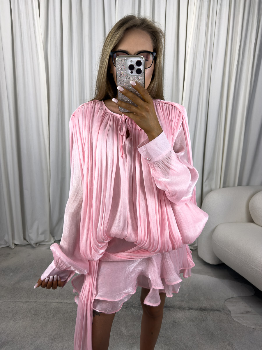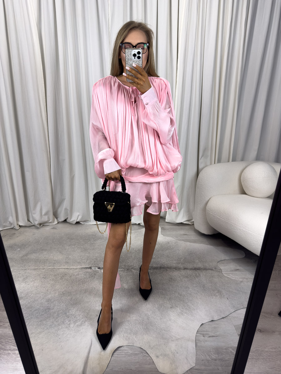 Mini sukienka Shine to model, który idealnie łączy nowoczesność z romantyzmem, co czyni ją doskonałym wyborem na specjalne okazje, letnie przyjęcia czy wieczorne wyjścia. Dzięki subtelnemu połyskowi i miękko układającemu się materiałowi, kreacja ta podkreśla kobiecą sylwetkę w lekki, niewymuszony sposób. Mimo luźniejszej formy, sukienka efektownie modeluje figurę – przede wszystkim za sprawą zbluzowanego fasonu i finezyjnie zarysowanej linii bioder.
