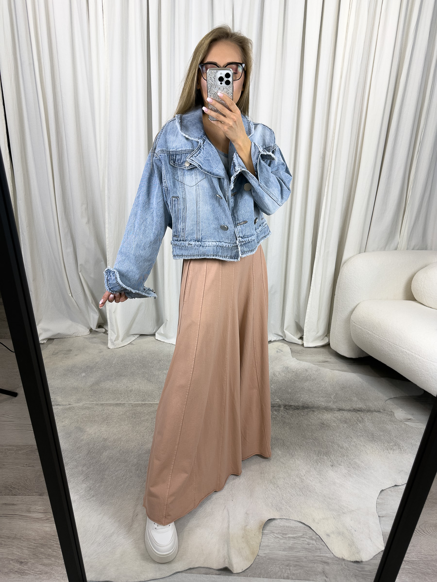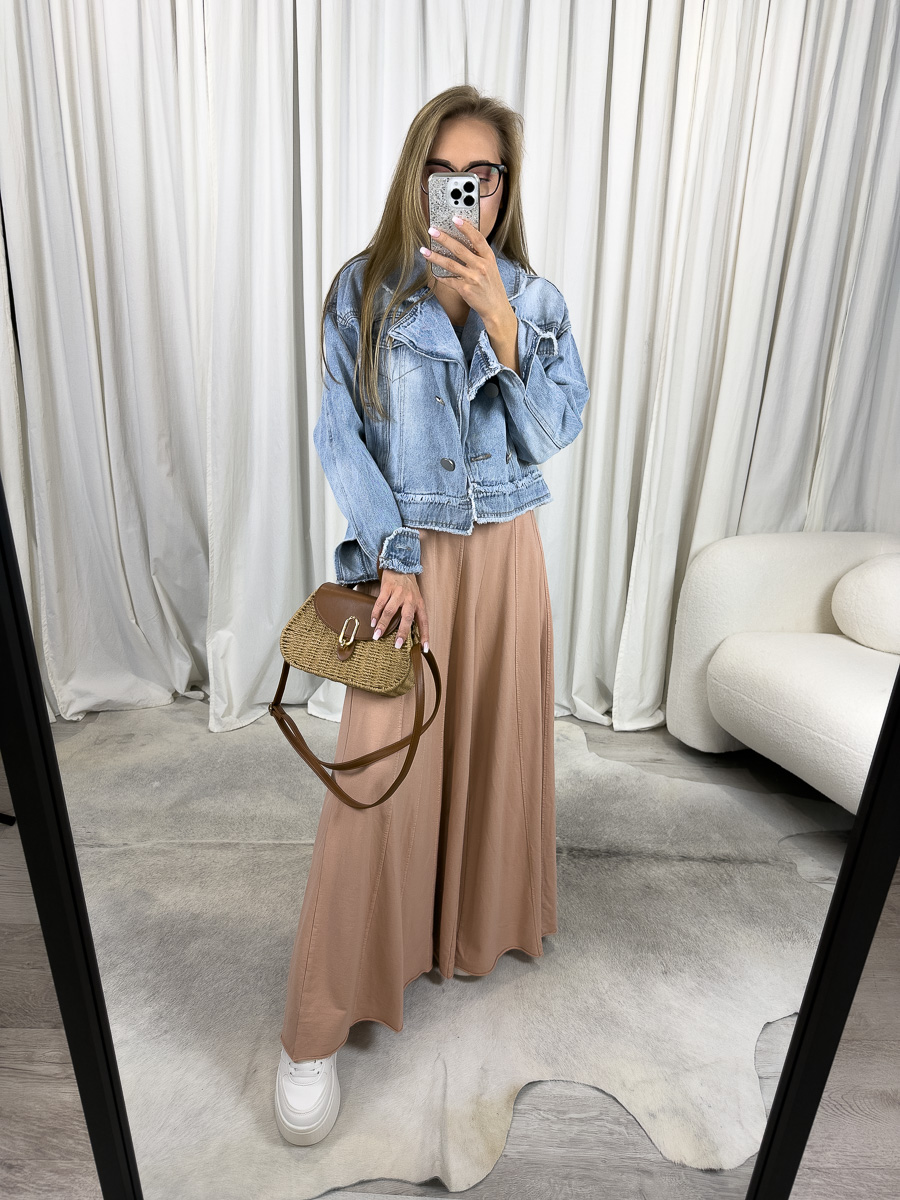 Model zachwyca szerokimi, zwiewnymi nogawkami, które pięknie układają się podczas ruchu, nadając stylizacji lekkości oraz delikatnego, zmysłowego charakteru. Morelowy kolor to synonim elegancji i klasy, a jednocześnie doskonała baza do stylizacji zarówno w jasnych, jak i kontrastujących tonacjach.