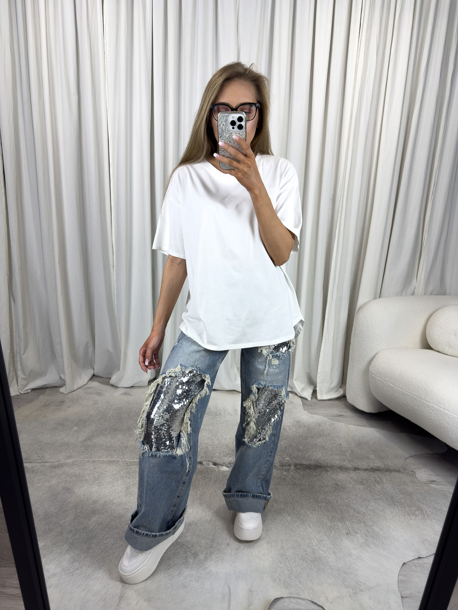 Przetarcia ozdobione srebrnymi cekinami to główny element dekoracyjny, dzięki któremu spodnie wyróżniają się na tle klasycznych modeli. Ten detal dodaje im charakteru oraz sprawia, że świetnie wpisują się w miejskie, nowoczesne looki. Co ważne, dzięki uniwersalnemu odcieniowi denimu spodnie możesz zestawić zarówno z t-shirtem, jak i z elegancką koszulą.