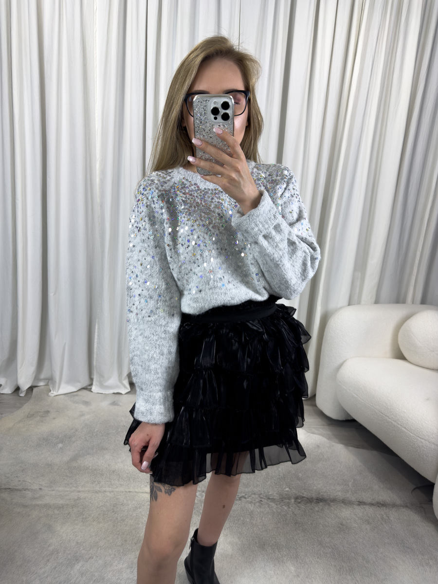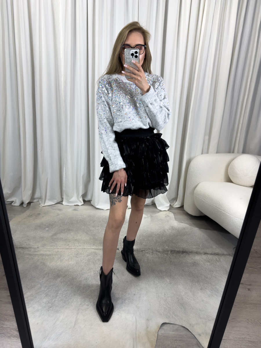 Sweter Sequins to model, który łączy w sobie komfort noszenia z niezwykłą estetyką i efektem wow. Jego największą ozdobą jest gęsto wyszywana górna część, pokryta różnej wielkości cekinami w chłodnym, srebrzystym odcieniu. Dzięki temu sweter nie tylko pięknie mieni się w świetle, ale również przyciąga spojrzenia i nadaje każdej stylizacji unikatowego charakteru. To doskonały wybór dla kobiet, które chcą połączyć codzienną wygodę z nutą elegancji i wieczorowego blasku.