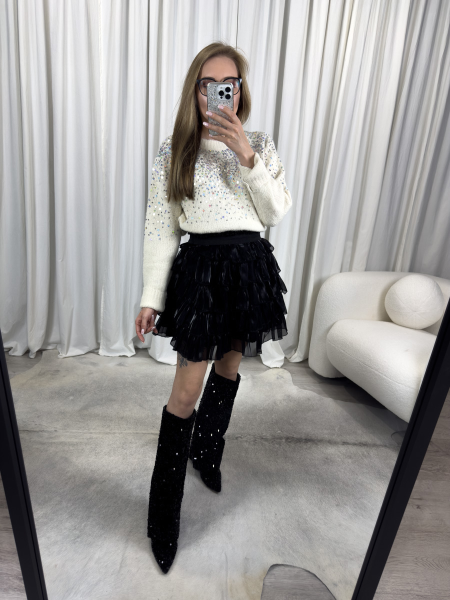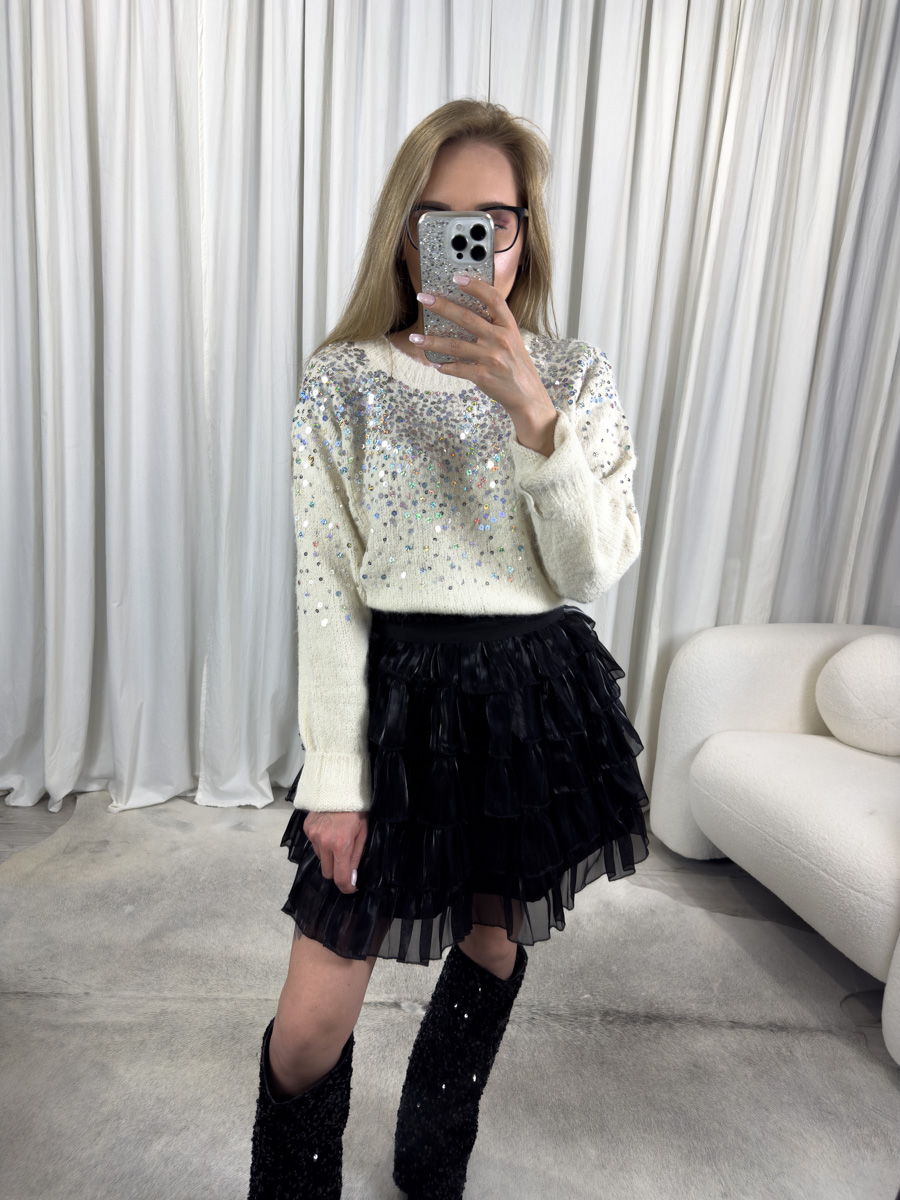 Ten miękki sweter to połączenie wygody z nutą wieczorowego błysku. Górna część została ozdobiona cekinami, które pięknie odbijają światło i przyciągają spojrzenia. Uszyty z miękkiej dzianiny w odcieniu ciepłej bieli, zapewnia przyjemne ciepło.